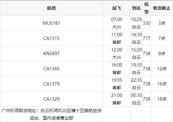 北京首都机场、大兴机场到广州(guangzhou)白云机场航班、飞机型号和收货截止时间如下: